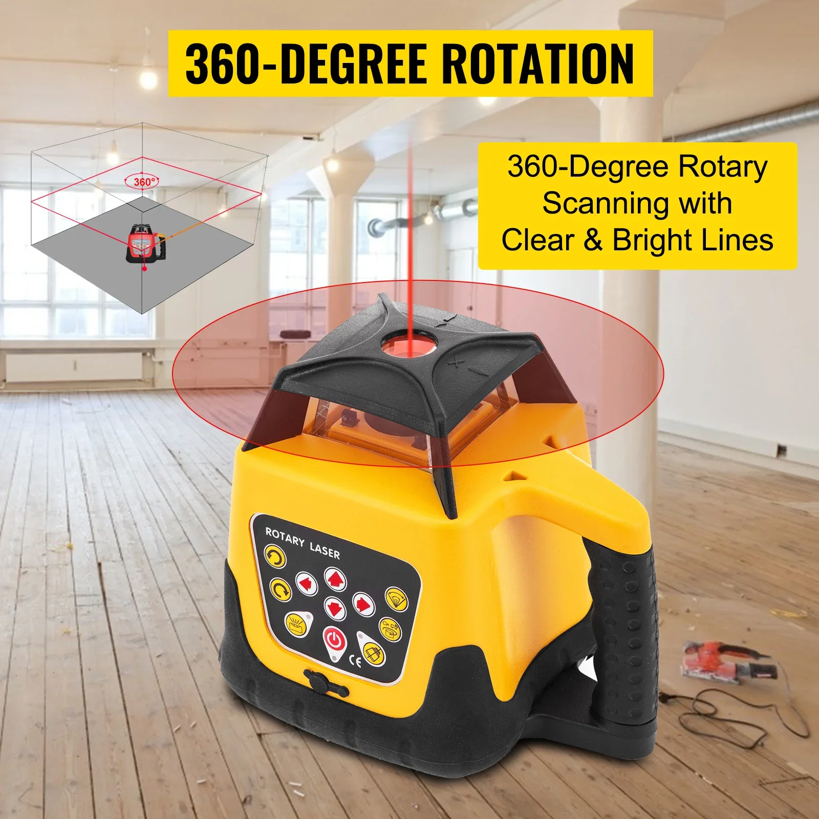 - 【360-ГРАДУСОВО И 500 М СКАНИРАНЕ】 – Външният лазерен нивелир осигурява 360-градусово сканиране с ясни, ярки и стабилни линии. Използван с лазерен детектор, обхватът на измерване на ротационния лазерен нивелир ще достигне 500 м в диаметър. Той се предлага и с лазерни очила, за да се вижда лесно лазерът при силна слънчева светлина.